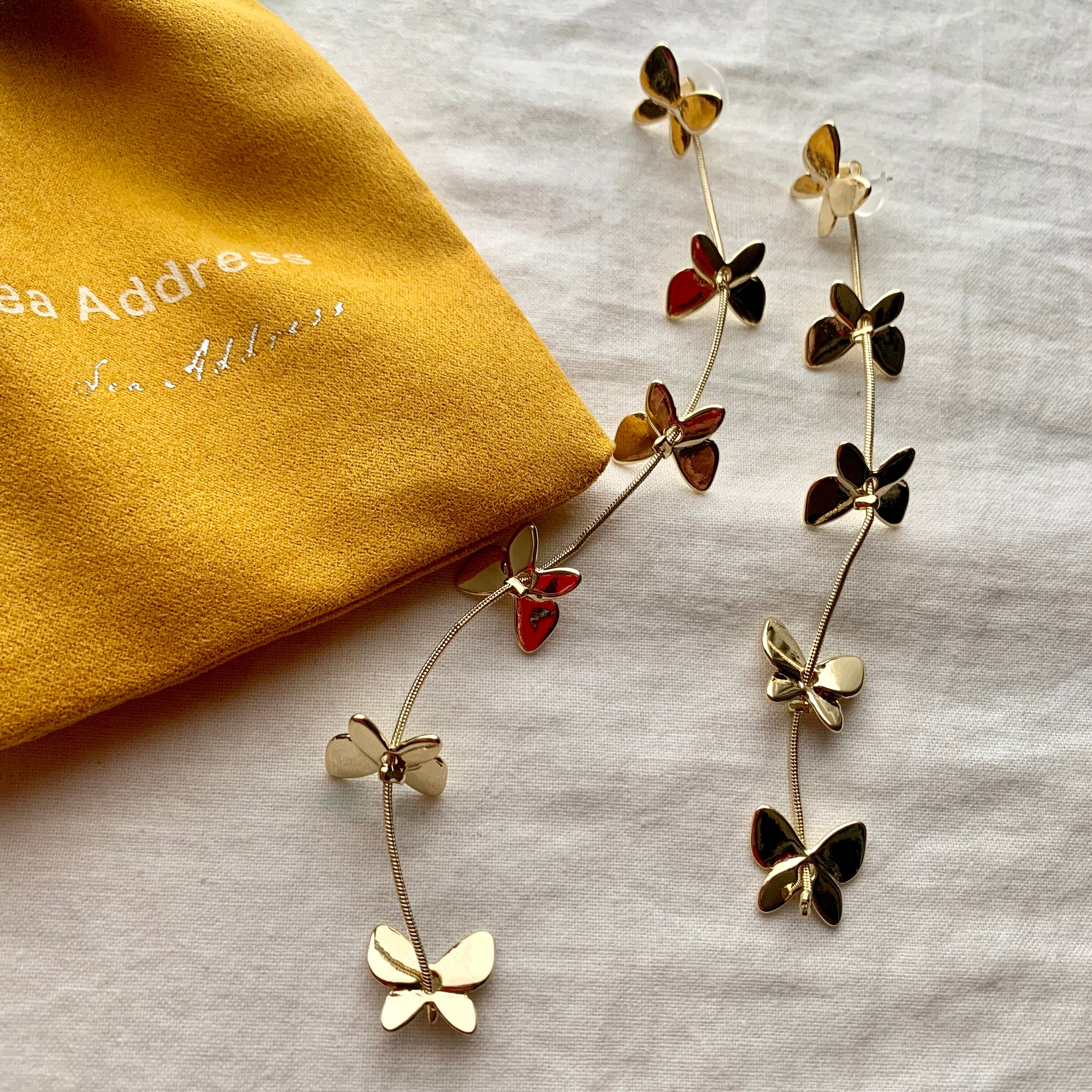 ゴールドチェーンに蝶々が散りばめられたロングピアス☆重くなく着け心地も◎