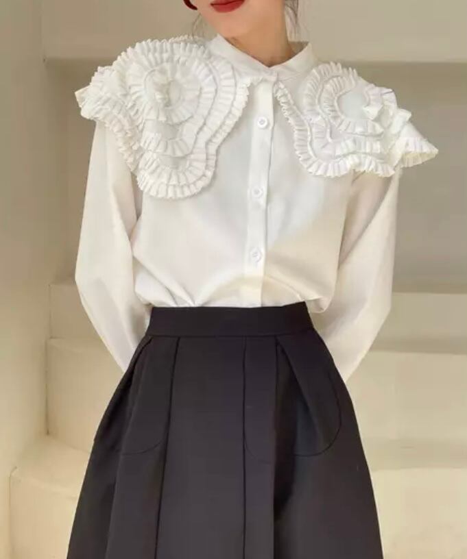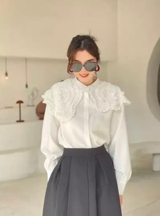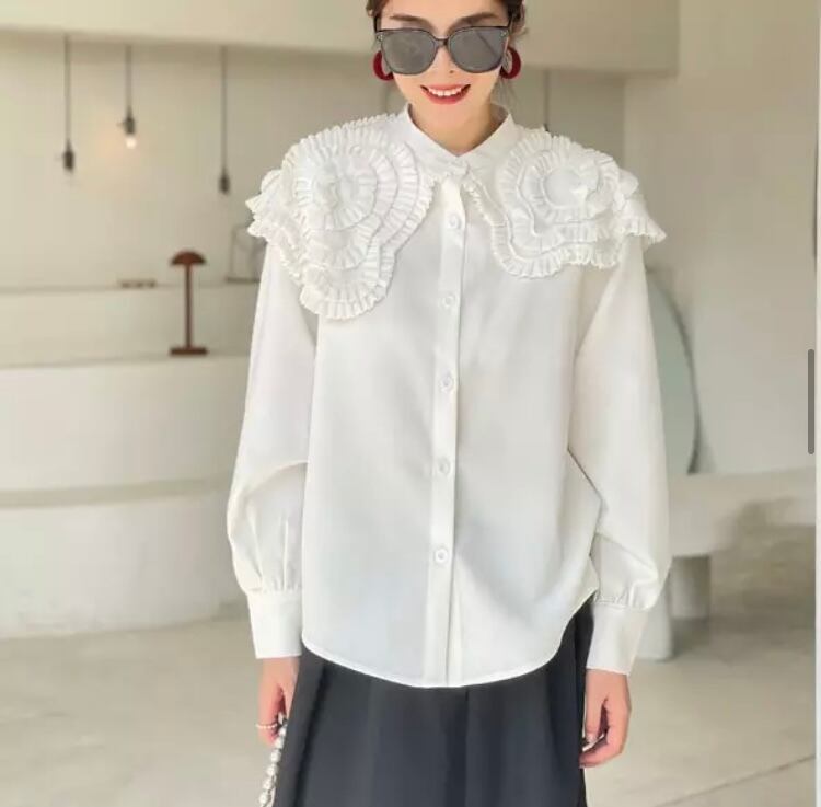 たかみえデザインの大きめ襟が小顔効果もあるおすすめブラウスです。サラッとした素材で夏場でも日焼けしたくない方におすすめです。